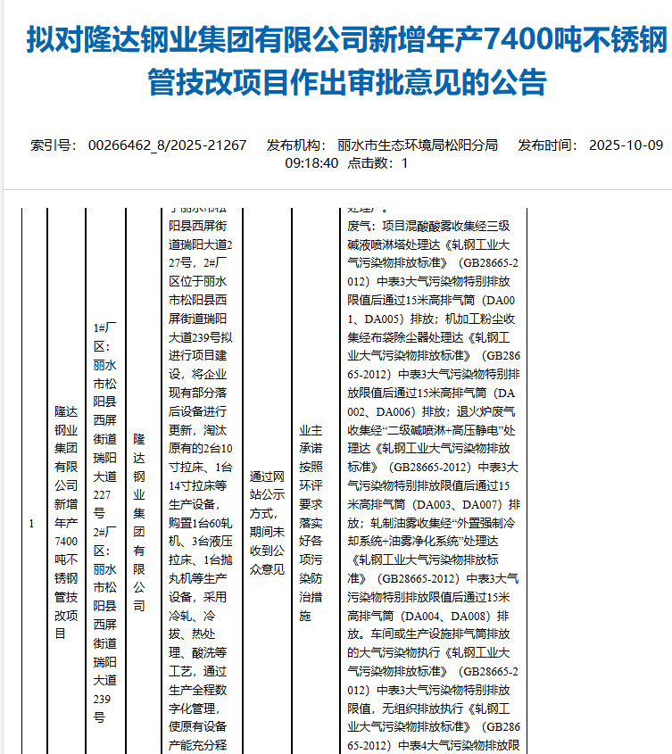2025年10月9日,麗水市生態(tài)環(huán)境局松陽分局擬對隆達鋼業(yè)集團有限公司新增年產7400噸不銹鋼管技改項目作出審批意見并對外進行公告,公告期為:2025年10月9日至2025年10月14日(5個工作日)。